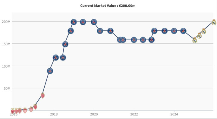 姆巴佩在2018年12月份时曾首次身价达到2亿欧。2020年4月份,他的身价从2亿欧跌到1.8亿欧。此后5年时间里,姆巴佩的身价一直在1.6亿欧-1.8亿欧之间摇摆。如今,姆巴佩时隔5年再次让身价回到了2亿欧。